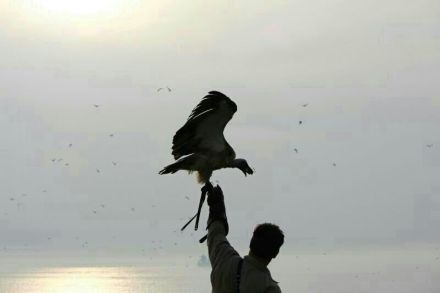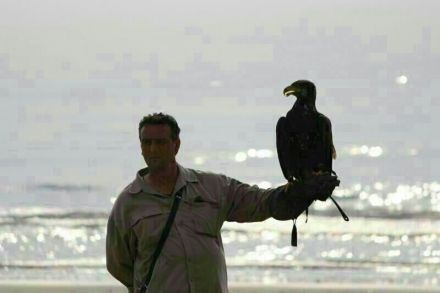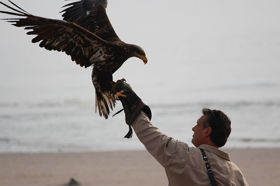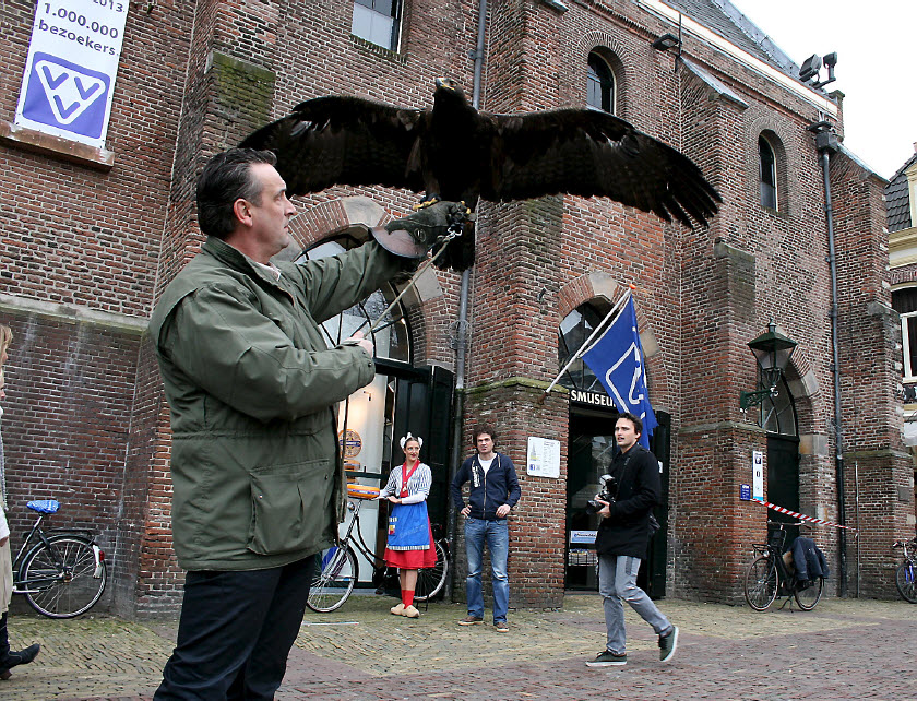Een van de roofvogels van valkenier Martin Doderer gaat op 8 maart de hoofdrol spelen bij de heropening van de verbouwde VVV in het Alkmaarse waaggebouw.